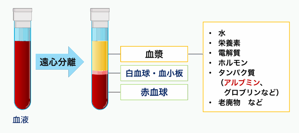 血漿には栄養素、電解質、ホルモン、タンパク質(アルブミン、グロブリンなど)などが含まれています。この血漿に含まれるタンパク質の総称を血漿タンパク質と呼んでいます。