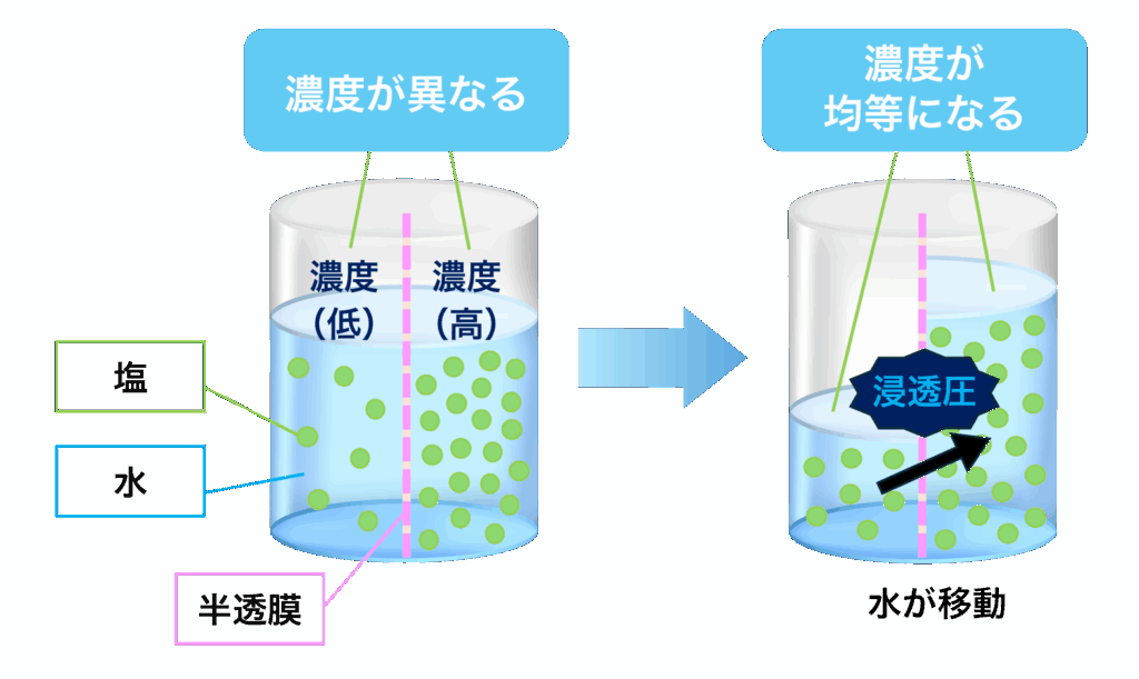 この現象を「浸透(しんとう)」といい、浸透しようとする圧力のことを「浸透圧(しんとうあつ)」といいます。